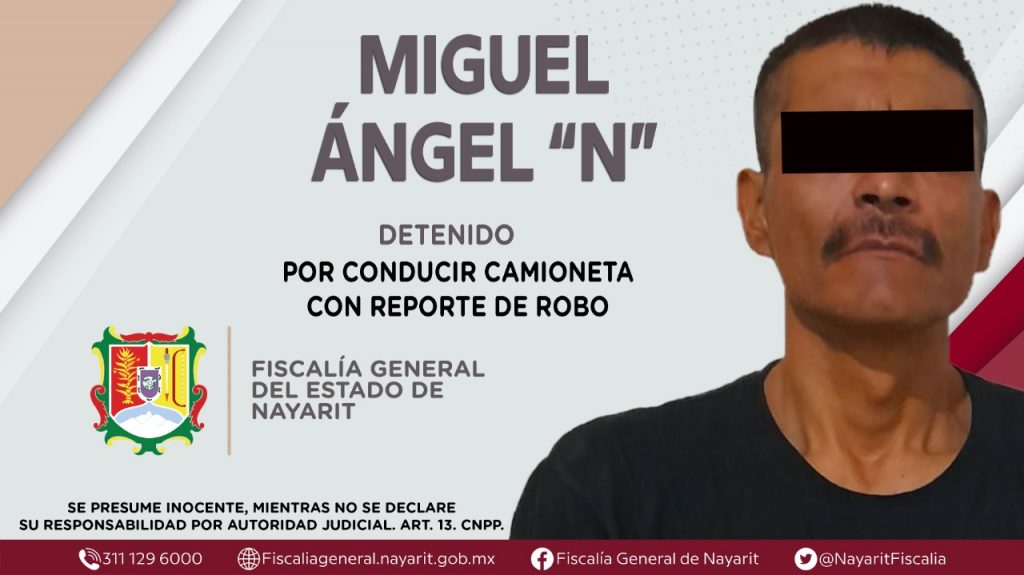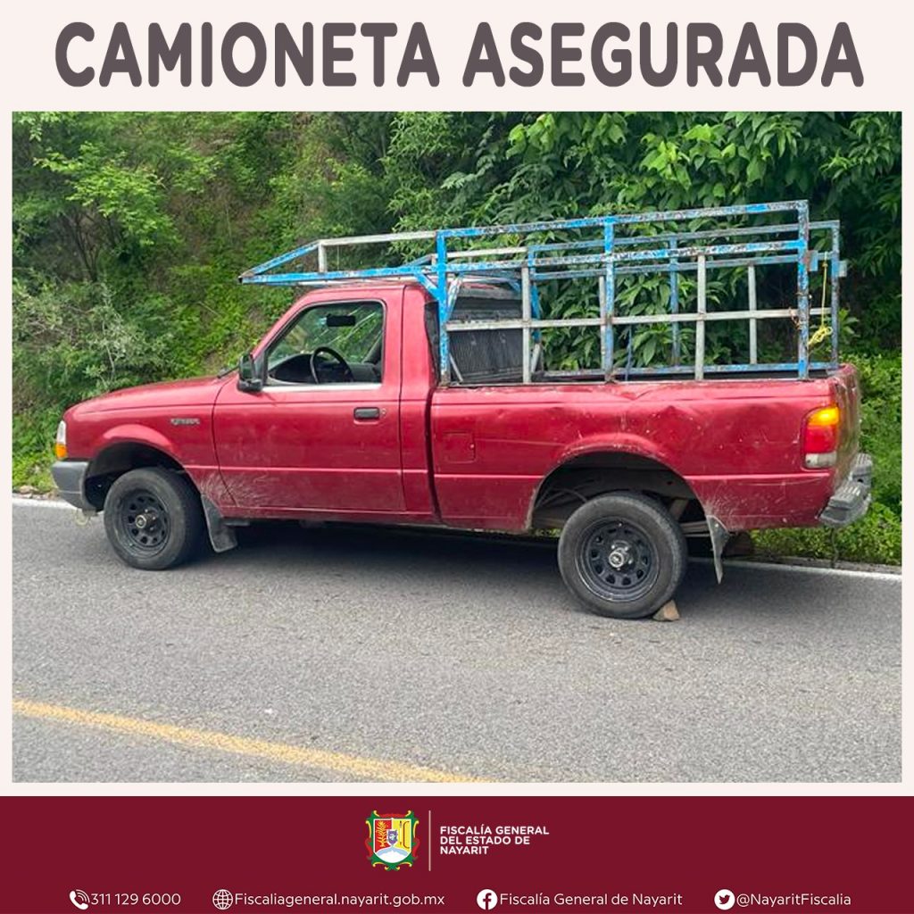 Dicha unidad es de la marca Ford, tipo PickUp, color rojo, con placas de circulación PE-60-253 del estado de Nayarit. Cabe señalar que se detuvo en flagrancia a Miguel Ángel “N”, quien conducía el vehículo automotor; tanto él como la camioneta fueron puestos a disposición del Ministerio Público, para las gestiones legales que procedan.