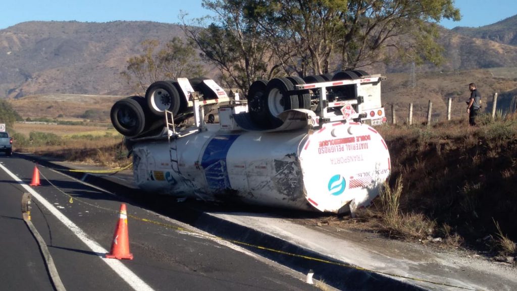 El Gobierno del Estado de Nayarit a través de La Secretaría de Seguridad y Protección Ciudadana, atiende reporte de pipa que volcara sobre la autopista 15D Tepic – Guadalajara, sobre el kilómetro 104+600.