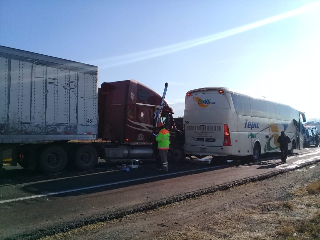 Se informa que se encuentra suspendido el paso vehicular en la autopista 15D, con sentido de Tepic – Guadalajara, sobre el kilómetro 107+400, esto derivado de un accidente automovilístico en el que participaran un vehículo pickup, un autobús y un trailer.