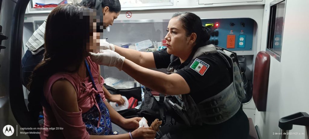 Al arribar a la zona, se encontró a una menor de dieciséis (16) años edad, originaria del Estado de Jalisco, la cual presentara una herida en el mentón de aproximadamente tres (3) centímetros, por lo cual se procedió a desinfectar la zona y realizar la curación, una vez que fue estabilizada no requirió un traslado a urgencias médicas.