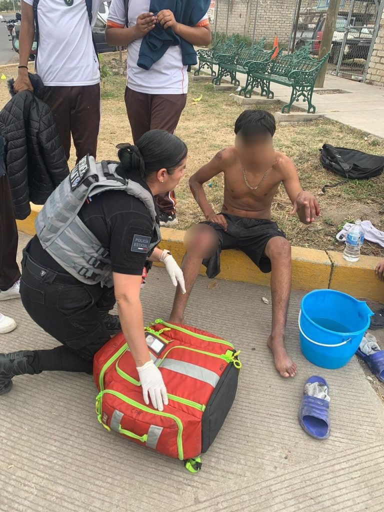 Los paramédicos de la Unidad Médica Táctica acudieron al lugar encontrando a un masculino orientado sentando en una banqueta con múltiples heridas y desprendimiento de uña de uno de sus dedos, posteriormente se atendió a dos (2) masculinos con heridas dermo escoriaciones, asimismo, se le brindo atención médica a una fémina presentando golpes contusos en extremidad inferior derecha.