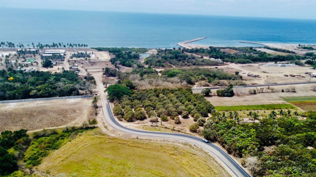 «Avanzan los estudios previos para continuar los trabajos de planeación a fin de construir el Puerto Nayarit, en la Boca de Chila: en esta fotografía se alcanzan a apreciar los primeros rompeolas y las primeras instalaciones de lo que será una guarnición de la Secretaría de Marina. Muy pronto, esta será la llave de nuestro estado para que los productos de nuestra tierra lleguen a todo el mundo».