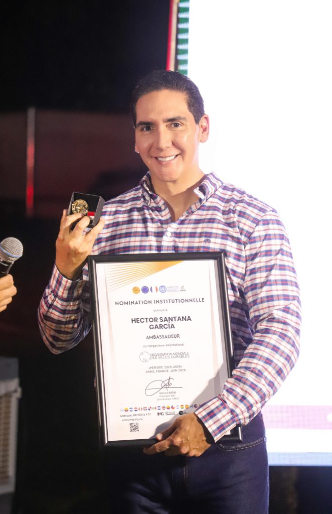 En esta rendición de cuentas estuvo presente el regidor Octavio Valencia quien agradeció al alcalde por su confianza para ser el representante del H. XII Ayuntamiento en España, el regidor compartió los avances obtenidos durante su participación en la Feria Internacional de Turismo (FITUR) en Madrid, quien le hizo entrega al presidente Santana García, durante su intervención un reconocimiento y medalla como embajador.