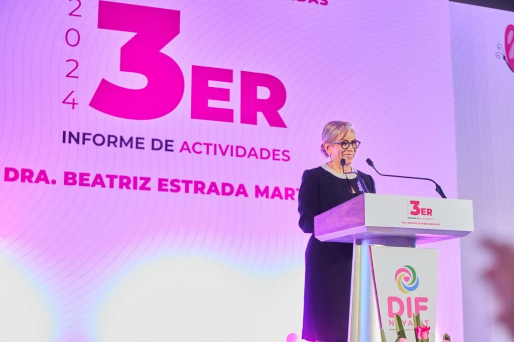 En un evento lleno de reconocimiento y compromiso social, la doctora Beatriz Estrada Martínez, presidenta del Sistema DIF Nayarit, presentó su Tercer Informe de Actividades, destacando los logros obtenidos en el último año para beneficio de las familias nayaritas, acompañada de su esposo, el gobernador del estado, Miguel Ángel Navarro Quintero, así como de su familia, funcionarios de los tres órdenes de gobierno y medios de comunicación.