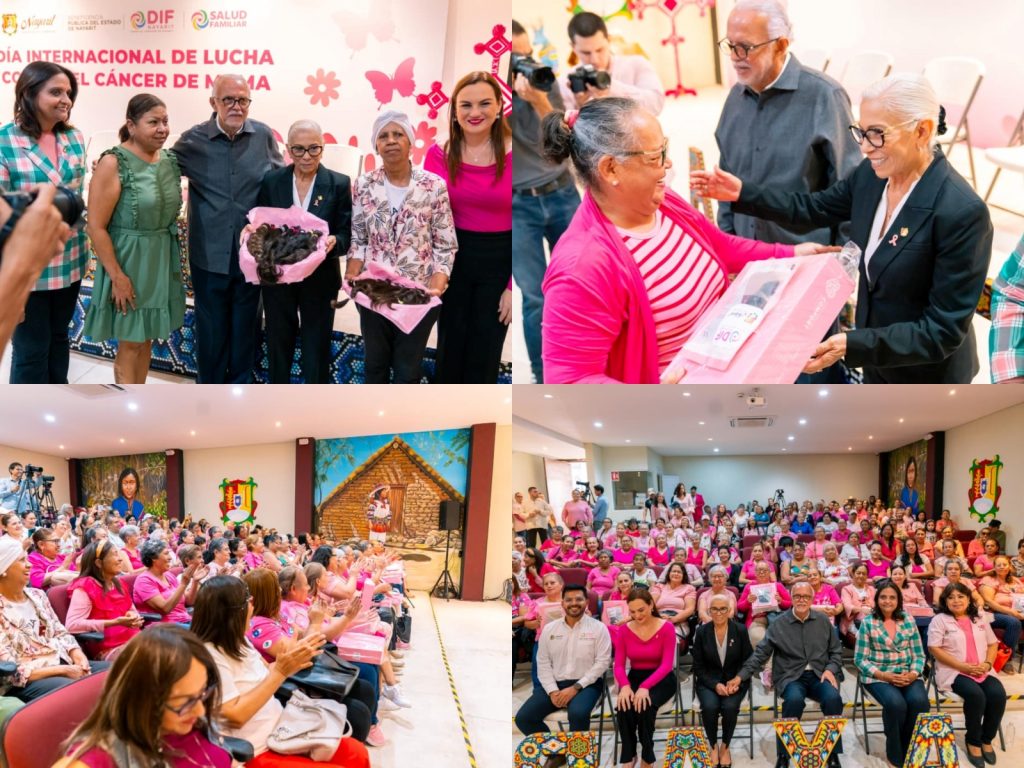 En un ambiente de calidez y sensibilidad, la presidenta del Sistema DIF Nayarit, doctora Beatriz Estrada Martínez, y su esposo, el gobernador del estado, Miguel Ángel Navarro Quintero, encabezaron la entrega de más de 200 apoyos —entre prótesis de silicón de mama, brasieres y pelucas oncológicas artesanales—, a 111 mujeres de 12 municipios de la entidad, que han enfrentado con valentía el proceso de la lucha contra el cáncer.