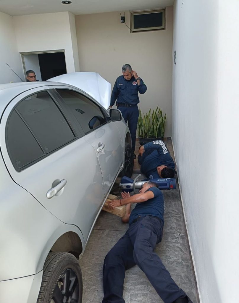 Las acciones ejercidas por el cuerpo de bomberos consistieron en utilizar la herramienta hidráulica conocida como quijadas de la vida para lograr levantar el vehículo y realizar las maniobras necesarias para extraer al gato del motor.