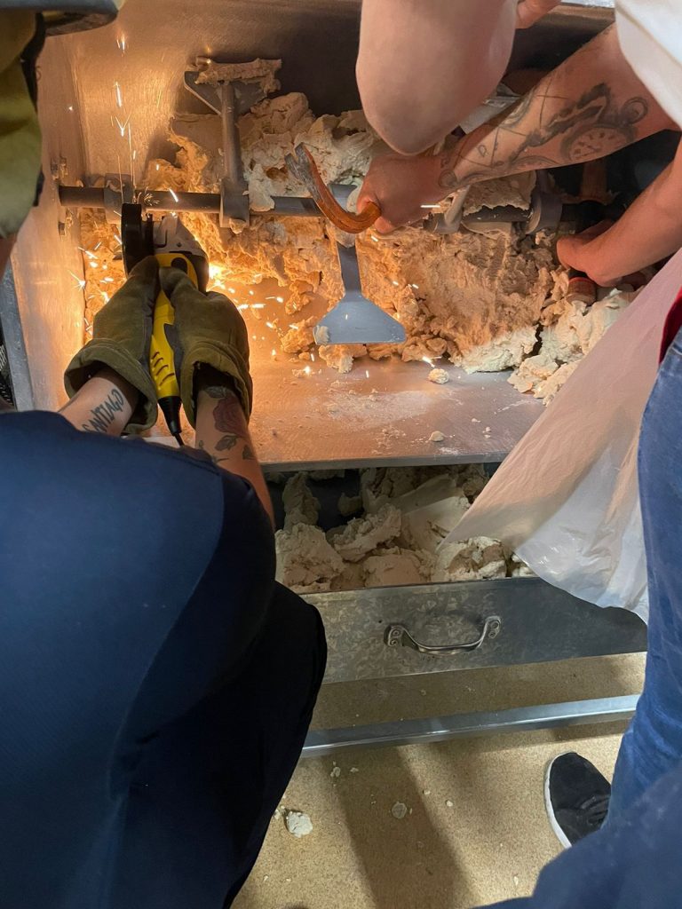 Ante el reporte recibido a la línea 9-1-1, los bomberos estatales se dirigieron rápidamente a la tienda, donde se encontró a una femenina que tuviera el brazo izquierdo atrapado en la tina revolvedora de masa de una máquina de tortillas.