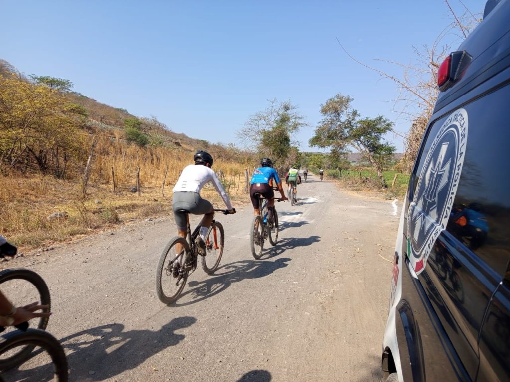 Ahuacatlán, Nayarit; 18 de mayo de 2025.– La Secretaría de Seguridad y Protección Ciudadana, a través del Grupo de Atención Médica Táctica, brindó apoyo en materia de seguridad y atención prehospitalaria durante el evento deportivo de ciclismo de montaña «Ruta de la Caña», realizado en el poblado de Santa Isabel, municipio de Ahuacatlán.