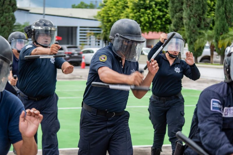 En las prácticas, los elementos realizan el correcto uso de distintas herramientas de contención, protección con el bastón PR 24, escudo, equipo antimotín, formaciones y desplazamientos para lograr una intervención adecuada y apegada a la protección de los derechos humanos de todos los posibles involucrados.