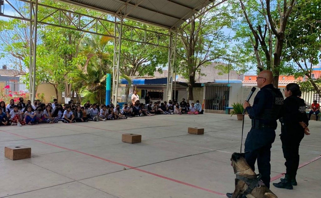 La Secretaría de Seguridad y Protección Ciudadana a través de la Unidad Canina K9 de la Policía Estatal, asiste a planteles educativos de la capital nayarita, para brindar conocimientos en materia de prevención al delito y seguridad.