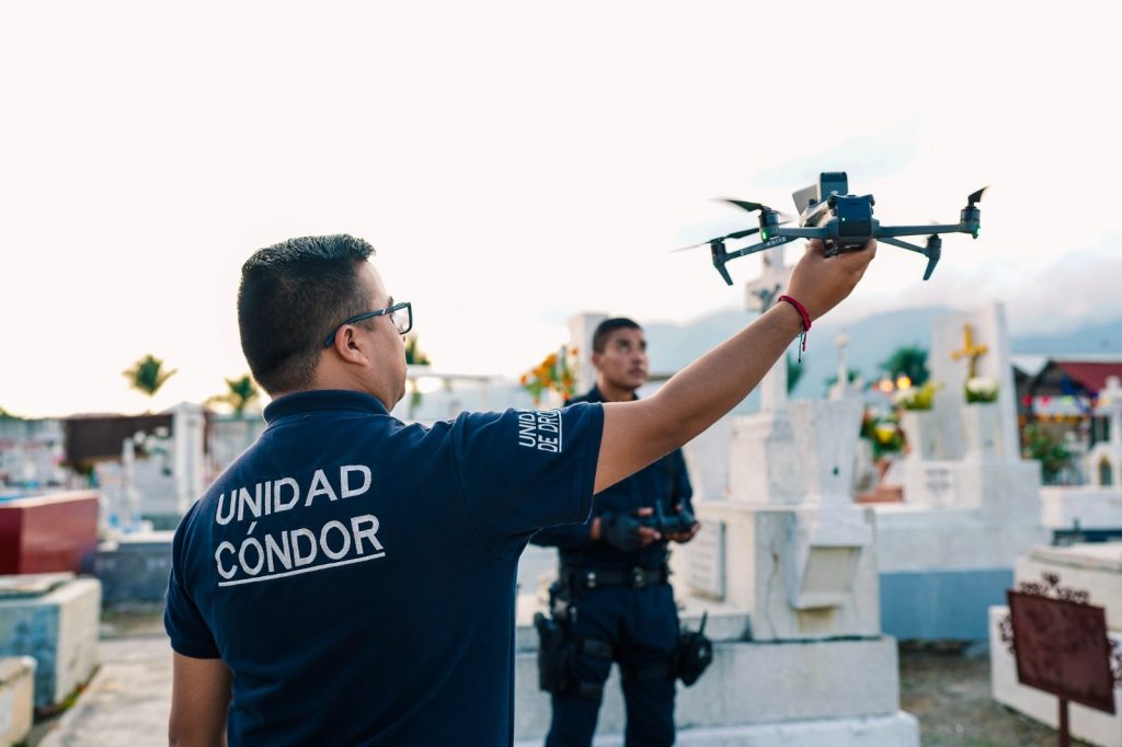 De igual forma, personal perteneciente a la Unidad Cóndor (Drones), brinda vigilancia aérea a través de aeronaves no tripuladas, monitoreando por sectores en los diferentes panteones y calles aledañas, con el propósito de fortalecer las acciones en materia de seguridad.