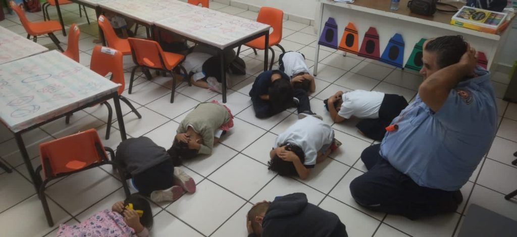 De igual forma, se llevó a cabo una práctica con un simulacro de sismo en donde las maestras al escuchar la alarma de advertencia conformaron las brigadas y procedieron a extraer a las y los menores del aula con orden y llevándolos al punto de reunión seguro.