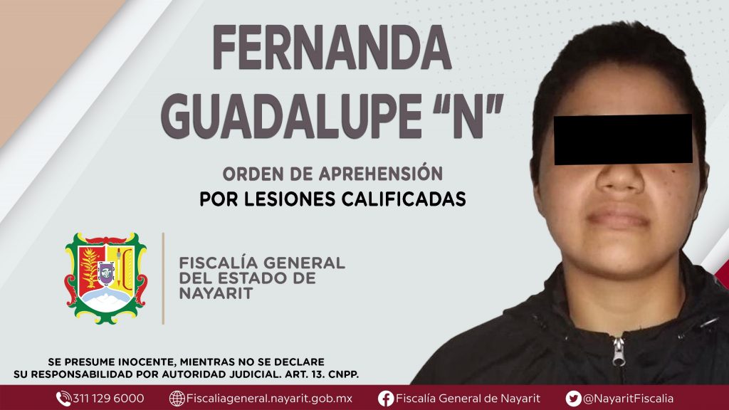 La Fiscalía General del Estado a través de la Agencia de Investigación Criminal dio cumplimiento a una orden de aprehensión en el municipio de Xalisco contra Fernanda Guadalupe “N”, por su presunta participación en hechos que según apreciación de la ley configuran el delito de lesiones calificadas, cometido en agravio de una persona de sexo masculino de identidad reservada.