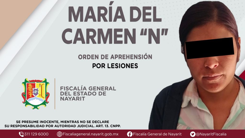 La Fiscalía General de Nayarit a través de la Agencia de Investigación Criminal dio cumplimiento a una orden de aprehensión en el municipio de Xalisco contra María del Carmen “N”, por su presunta participación en hechos que según apreciación de la ley encuadran el delito de lesiones, cometido en agravio de una persona de sexo femenino de identidad reservada.