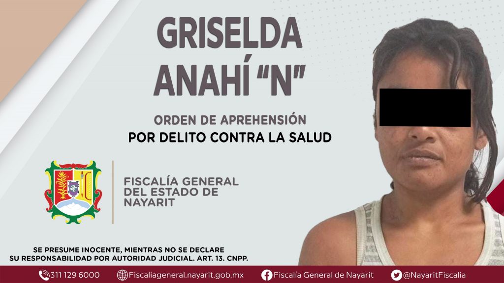 Elementos de la Agencia de Investigación Criminal de Nayarit ejecutaron una orden de aprehensión en la ciudad de Tepic contra Griselda Anahí “N”, por su presunta participación en hechos que según apreciación de la ley encuadran el delito contra la salud en su modalidad de narcomenudeo -en la hipótesis de posesión de psicotrópicos (metanfetaminas) y estupefacientes (marihuana)-, con fines de comercio en su variante de venta, cometido en contra de la sociedad.