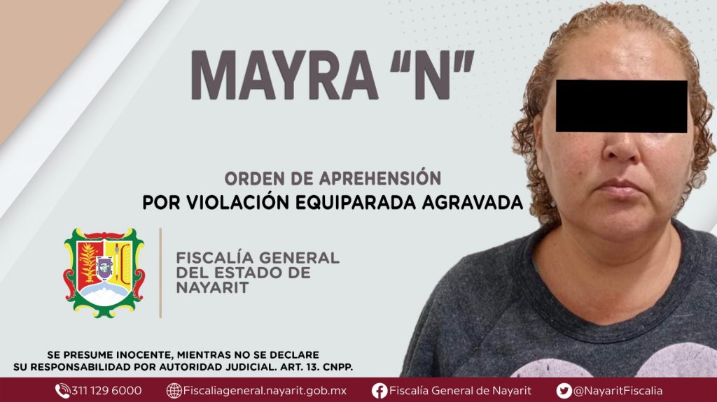 La Fiscalía General del Estado a través de la Agencia de Investigación Criminal dio cumplimiento a una orden de aprehensión en la ciudad de Tepic contra Mayra “N”, por su presunta participación en hechos que según valoración de la ley configuran el delito de violación equiparada agravada, en su modadlidad de omisión por ser garante del bien jurídico tutelado, cometido en agravio de una niña de identidad reservada.