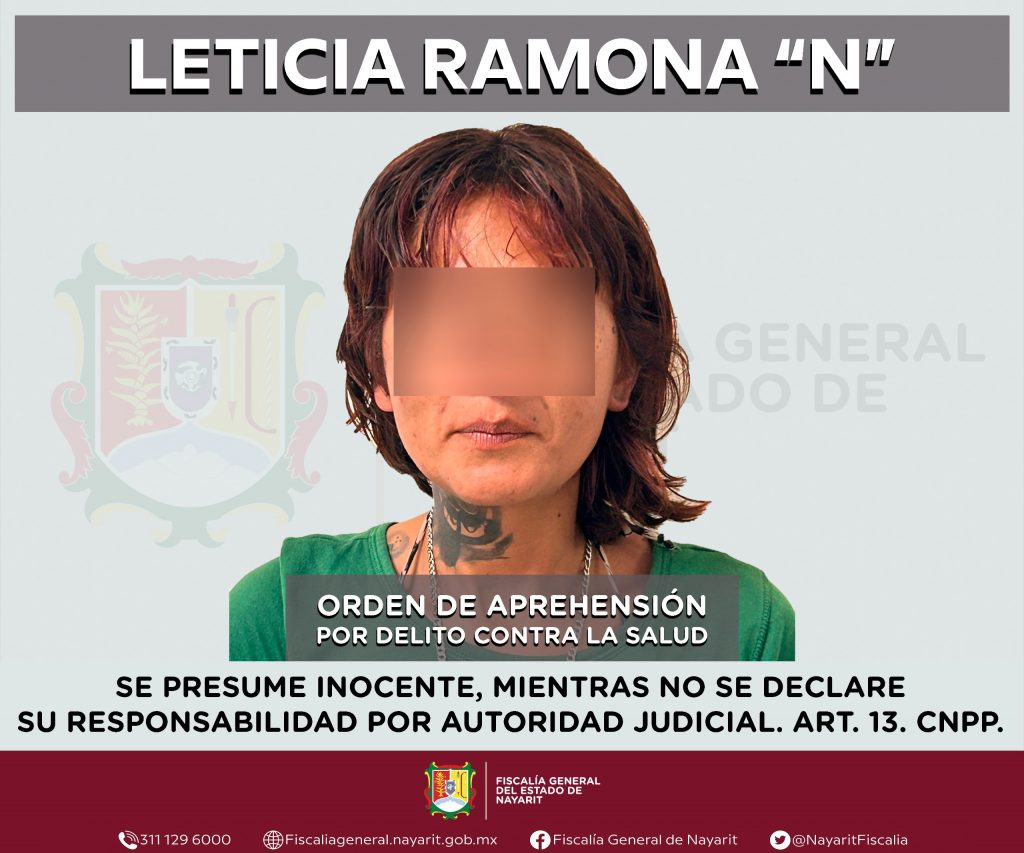 La Fiscalía General del estado de Nayarit a través de la Agencia de Investigación Criminal ejecutó una orden de aprehensión en la ciudad de Tepic contra Leticia Ramona “N”, por su presunta participación en hechos que según apreciación de la ley encuadran el delito contra la salud en su modalidad de narcomenudeo -en la hipótesis de posesión de psicotrópicos-, cometido en agravio de la sociedad.