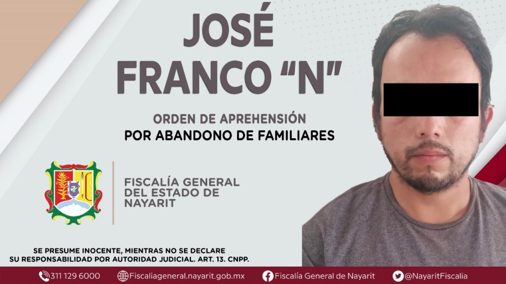 Elementos de la Agencia de Investigación Criminal dieron cumplimiento a una orden de aprehensión en la ciudad de Tepic contra José Franco “N”, quien es originario del municipio de Compostela y vecino de la capital nayarita, por su presunta participación en hechos que bajo la apreciación de la ley configuran el delito de abandono de familiares, cometido en agravio de una persona menor de dieciocho años de identidad reservada.