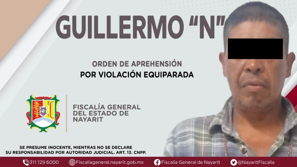 La Fiscalía General de Nayarit a través de la Agencia de Investigación Criminal dio cumplimiento a una orden de aprehensión en el municipio de Acaponeta contra Guillermo “N”, por su presunta participación en hechos que según apreciación de la ley encuadran el delito de violación equiparada, cometido en agravio de una persona menor de dieciocho años de identidad reservada.