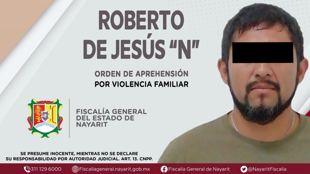 La Fiscalía General del Estado a través de la Agencia de Investigación Criminal dio cumplimiento a una orden de aprehensión en la localidad Mezcales, municipio de Bahía de Banderas contra Roberto de Jesús “N”, por su presunta participación en hechos que según apreciación de la ley configuran el delito de violencia familiar, cometido en agravio de una persona de sexo femenino cuya identidad es reservada.