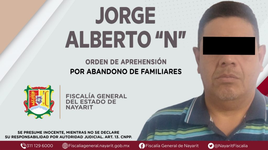 Elementos de la Agencia de Investigación Criminal de Nayarit ejecutaron una orden de aprehensión en la capital nayarita contra Jorge Alberto “N”, por su presunta participación en hechos que según apreciación de la ley encuadran el delito de abandono de familiares, cometido en agravio de dos personas menores de dieciocho años cuyas identidades se reservan.