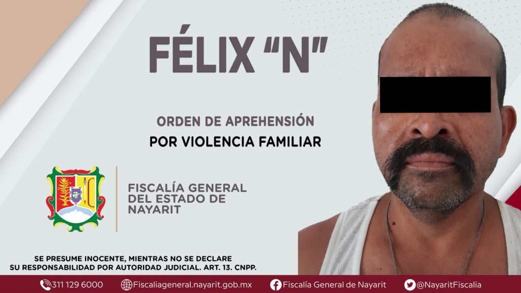 La Fiscalía General del Estado a través de la Agencia de Investigación Criminal dio cumplimiento a una orden de aprehensión en la localidad Cofradía de Cuyutlán, municipio de Rosamorada contra Félix “N”, por su presunta participación en hechos que según apreciación de la ley configuran el delito de violencia familiar, cometido contra una persona de sexo femenino de identidad reservada.