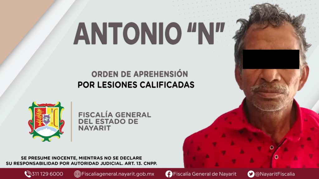 La Fiscalía General del Estado a través de la Agencia de Investigación Criminal dio cumplimiento a una orden de aprehensión en el municipio de Xalisco contra Antonio “N”, por su presunta participación en hechos que según apreciación de la ley encuadran el delito de lesiones calificadas, ilícito cometido en agravio de una persona de sexo masculino de identidad reservada.
