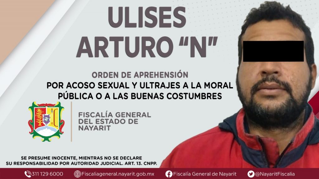 La Fiscalía General del Estado a través de la Agencia de Investigación Criminal dio cumplimiento a una orden de aprehensión en la capital nayarita contra Ulises Arturo “N”, por su presunta participación en hechos que bajo la apreciación de la ley configuran los delitos de acoso sexual y ultrajes a la moral pública o a las buenas costumbres, cometidos en contra de una persona de sexo femenino de identidad reservada.