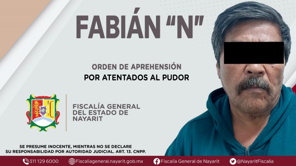 La Fiscalía General del Estado a través de la Agencia de Investigación Criminal cumplimentó una orden de aprehensión en la capital nayarita contra Fabián “N”, por su presunta participación en hechos que bajo la apreciación de la ley configuran el delito de atentados al pudor, cometido en agravio de una persona menor de dieciocho años de identidad reservada.