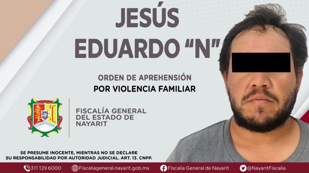La Fiscalía General de Nayarit a través de la Agencia de Investigación Criminal dio cumplimiento a una orden de aprehensión en la capital nayarita contra Jesús Eduardo “N”, por su presunta participación en hechos que según apreciación de la ley encuadran el delito de violencia familiar, en perjuicio de una persona de sexo femenino de identidad reservada.