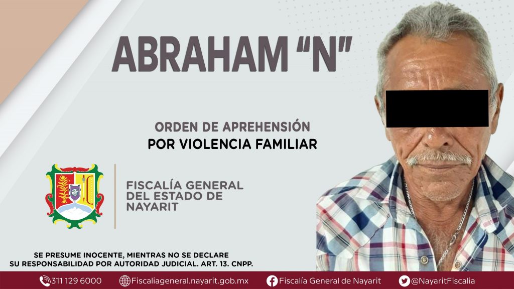 La Fiscalía General del Estado a través de la Agencia de Investigación Criminal dio cumplimiento a una orden de aprehensión en la ciudad de Tepic contra Abraham “N”, por su presunta participación en hechos que según apreciación de la ley encuadran el delito de violencia familiar, cometido en agravio de una persona de sexo femenino de identidad reservada.