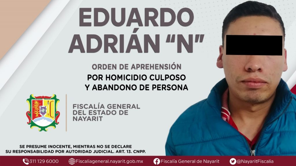 La Fiscalía General del Estado a través de la Agencia de Investigación Criminal dio cumplimiento a una orden de aprehensión en la capital nayarita contra Eduardo Adrián “N”, por su presunta participación en hechos que bajo la apreciación de la ley configuran los delitos de homicidio culposo y abandono de persona, por hechos cometidos el día 5 de septiembre del año 2021 en agravio de una persona de sexo masculino de identidad reservada.