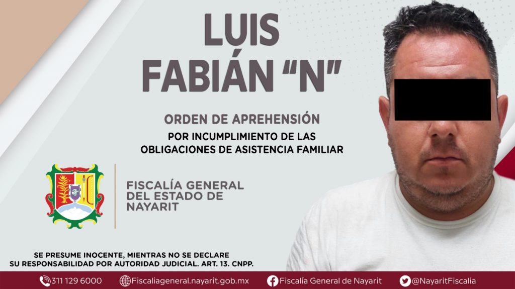 La Fiscalía General de Nayarit a través de la Agencia de Investigación Criminal dio cumplimiento a una orden de aprehensión en el municipio de Bahía de Banderas contra Luis Fabián “N”, por su presunta participación en hechos que según apreciación de la ley encuadran el delito de incumplimiento de las obligaciones de asistencia familiar, cometido en agravio de una persona de sexo femenino y una persona menor de dieciocho años, ambas víctimas de identidad reservada.