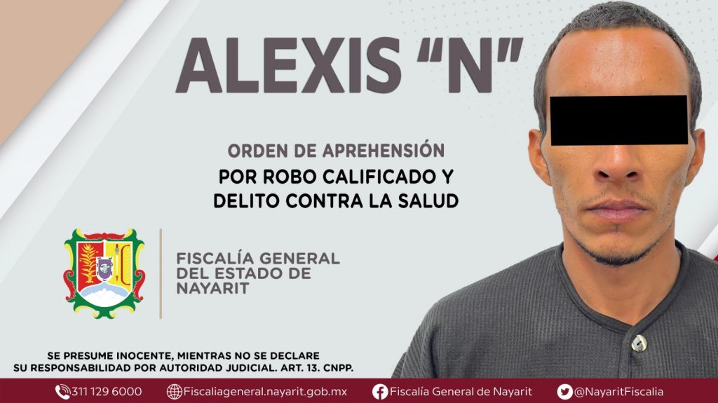 Elementos de la Agencia de Investigación Criminal de Nayarit ejecutaron dos órdenes de aprehensión en la ciudad de Tepic contra Alexis “N”, la primera por su presunta participación en hechos que según apreciación de la ley encuadran el delito de robo calificado, en tanto la segunda orden de aprehensión es como probable responsable de hechos que según la ley configuran el delito contra la salud en su modalidad de narcomenudeo -en su hipótesis de posesión de psicotrópicos (metanfetaminas)-, en agravio de una persona de sexo masculino y de la sociedad, respectivamente.