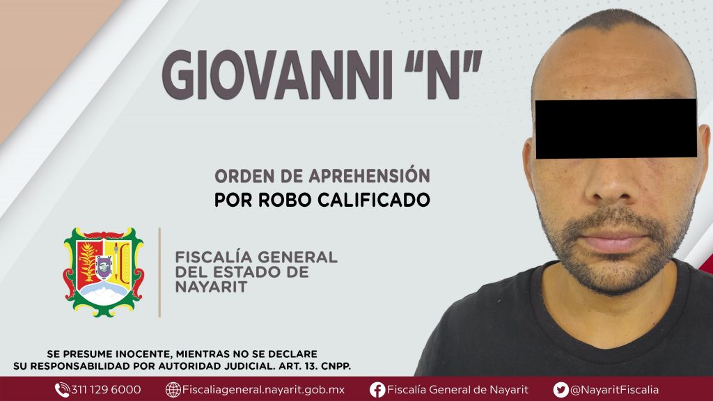 Elementos de la Agencia de Investigación Criminal de Nayarit ejecutaron una orden de aprehensión en la ciudad de Tepic contra Giovanni “N”, por su presunta participación en hechos que según apreciación de la ley configuran el delito de robo calificado, cometido en agravio de una persona de sexo masculino de identidad reservada.
