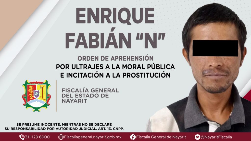 La Fiscalía General del Estado a través de la Agencia de Investigación Criminal dio cumplimiento a una orden de aprehensión en la capital nayarita contra Enrique Fabián “N”, por su presunta participación en hechos que según apreciación de la ley encuadran los delitos de ultrajes a la moral pública o a las buenas costumbres e incitación a la prostitución, cometidos en agravio de una persona menor de dieciocho años de identidad reservada.