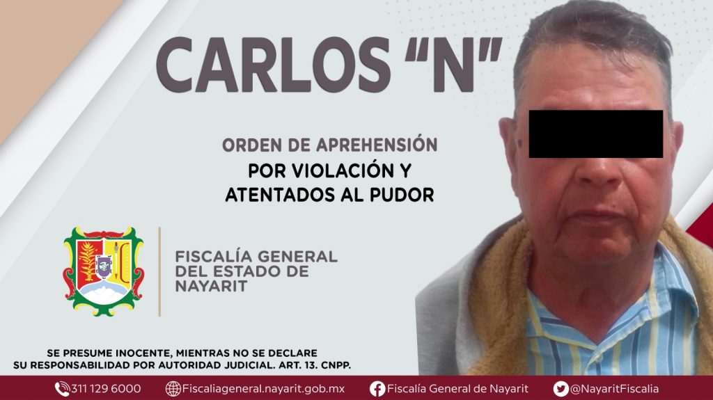 La Fiscalía General de Nayarit a través de la Agencia de Investigación Criminal dio cumplimiento a una orden de aprehensión en la ciudad de Tepic contra Carlos “N”, por su presunta participación en hechos que según apreciación de la ley encuadran los delitos de violación y atentados al pudor, el primer ilícito cometido contra una persona menor de dieciocho años, en tanto el segundo delito es en agravio de otra persona menor de dieciocho años, cuyas identidades se reservan.