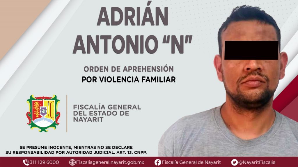 La Fiscalía General de Nayarit a través de la Agencia de Investigación Criminal ejecutó una orden de aprehensión en la ciudad de Tepic contra Adrián Antonio “N”, originario y vecino de la capital nayarita, por su presunta participación en hechos que según apreciación de la ley encuadran el delito de violencia familiar, cometido en agravio de una persona de sexo masculino que es hermano del detenido.