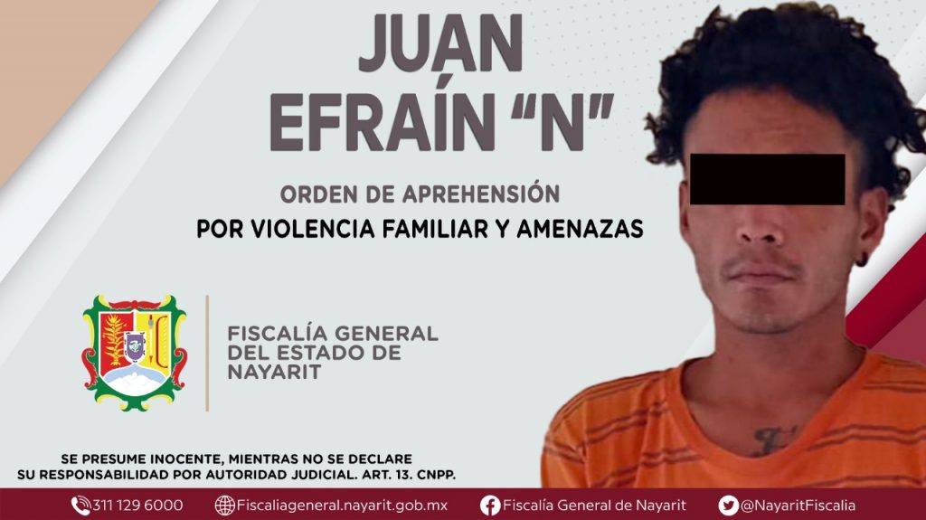 Elementos de la Agencia de Investigación Criminal de Nayarit ejecutaron una orden de aprehensión en la localidad Los Sabinos, municipio de Tepic contra Juan Efraín “N”, por su presuntiva responsabilidad penal en hechos que la ley califica como delito de violencia familiar y amenazas, cometidos en agravio de una persona de sexo femenino de identidad reservada.