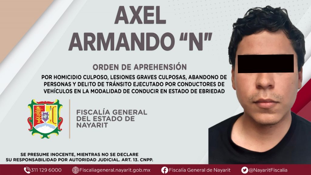 En la capital nayarita, la Fiscalía General de Nayarit a través de la Agencia de Investigación Criminal ejecutó una orden de aprehensión contra Axel Armando “N”, por su presunta participación en hechos que según apreciación de la ley encuadran los delitos de homicidio culposo, lesiones graves culposas, abandono de personas, así como delito de tránsito ejecutado por conductores de vehículos en la modalidad de conducir en estado de ebriedad, por hechos ocurridos en avenida Insurgentes el pasado 21 de agosto.