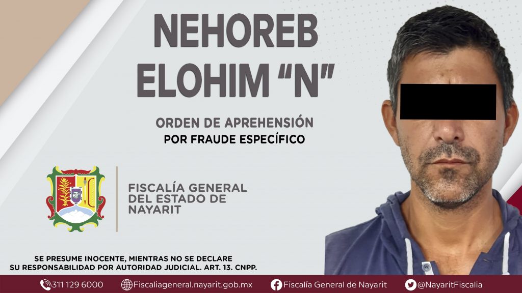 La Fiscalía General del Estado a través de la Agencia de Investigación Criminal dio cumplimiento a una orden de aprehensión en la capital nayarita contra Nehoreb Elohim “N”, por su presunta participación en hechos que según apreciación de la ley configuran el delito de fraude específico, cometido en contra de una mujer de identidad reservada.