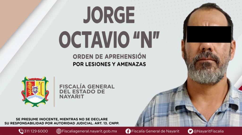 Elementos de la Agencia de Investigación Criminal de Nayarit ejecutaron una orden de aprehensión en la ciudad de Tepic contra Jorge Octavio “N”, por su presunta participación en hechos que según apreciación de la ley encuadran los delitos de lesiones y amenazas, cometidos contra una mujer de identidad reservada.