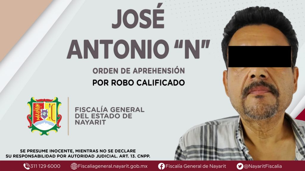 La Fiscalía General del Estado a través de la Agencia de Investigación Criminal dio cumplimiento a una orden de aprehensión en la ciudad de Tepic contra José Antonio “N”, por su presunta participación en hechos que según apreciación de la ley configuran el delito de robo calificado, cometido en agravio de una persona de sexo masculino de identidad reservada.
