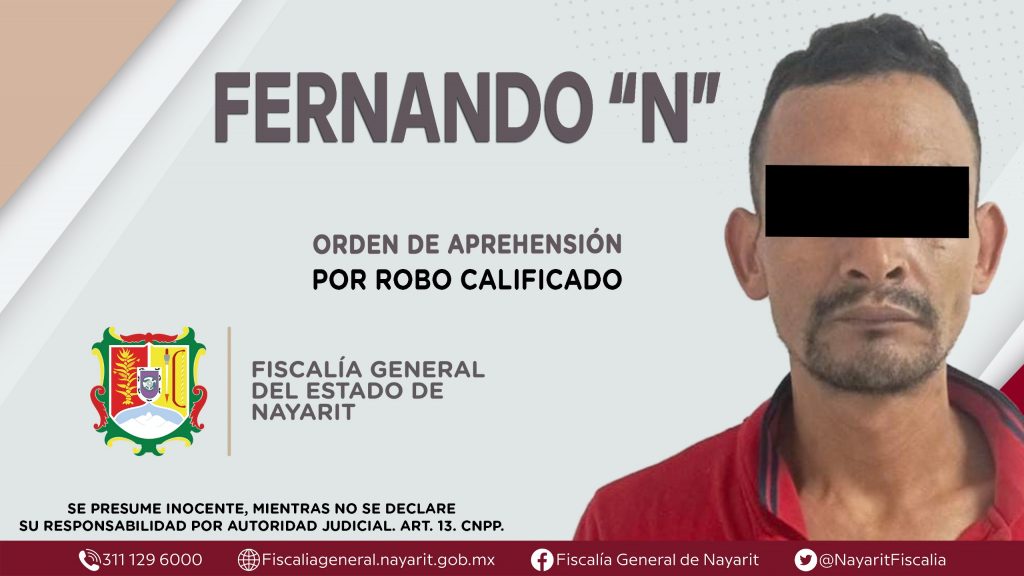 La Fiscalía General del Estado a través de la Agencia de Investigación Criminal dio cumplimiento a una orden de aprehensión en la ciudad de Tepic contra Fernando “N”, por su presunta participación en hechos que según apreciación de la ley configuran el delito de robo calificado, cometido en perjuicio de una persona de sexo masculino de identidad reservada.