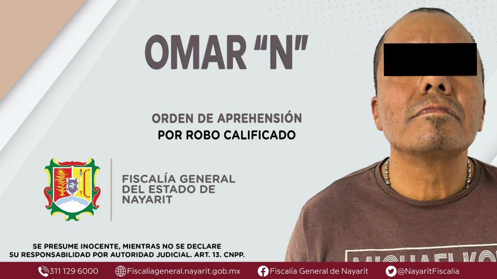 La Fiscalía General del Estado a través de la Agencia de Investigación Criminal dio cumplimiento a una orden de aprehensión en la capital nayarita contra Omar “N”, por su presunta participación en hechos que según apreciación de la ley configuran el delito de robo calificado, cometido en menoscabo de la cadena comercial Oxxo, S. A. de C. V.