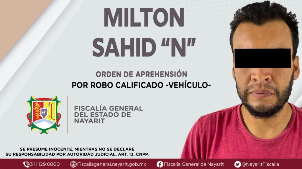 La Fiscalía General del Estado a través de la Agencia de Investigación Criminal dio cumplimiento a una orden de aprehensión en la ciudad de Tepic contra Milton Sahid “N”, por su presunta participación en hechos que bajo la apreciación de la ley configuran el delito de robo calificado -vehículo-, cometido en agravio de una persona de sexo femenino de identidad reservada.