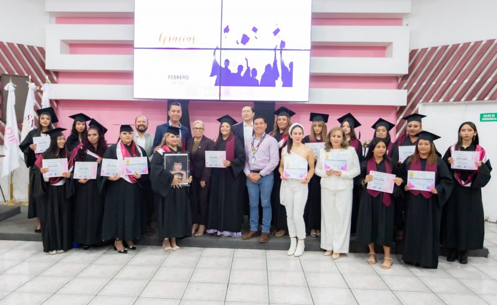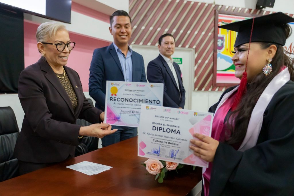La presidenta del Sistema DIF Nayarit, doctora Beatriz Estrada Martínez, encabezó la ceremonia de acto de clausura del ciclo ordinario febrero 2023–febrero 2024, de los cursos del Centro de Capacitación (CECAP) DIF, de los cuales egresaron 24 mujeres.