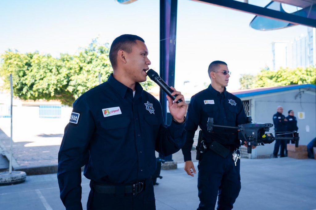 Los agentes de la Unidad de Drones compartieron con la comunidad educativa algunas de sus acciones enfocadas en la prevención del delito. Realizaron un vuelo de demostración y presentaron el uso especializado del equipamiento del C5 Móvil en misiones específicas.