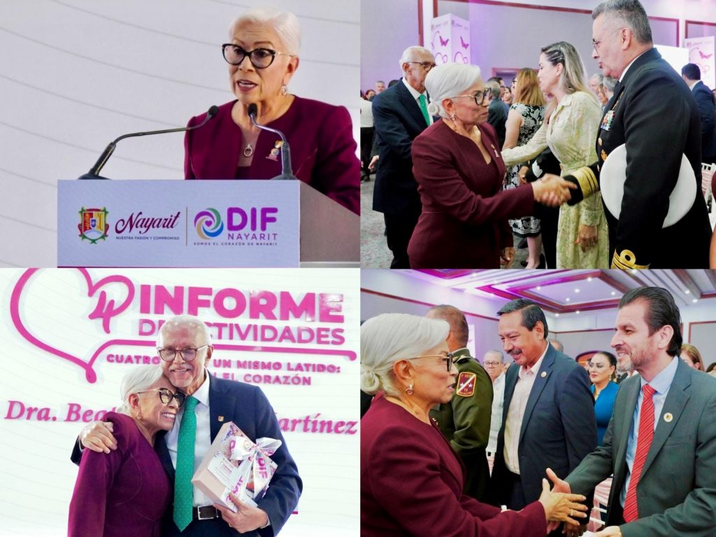 El gobernador del estado, Miguel Ángel Navarro Quintero, acompañó a su esposa, la presidenta del Sistema DIF Nayarit, doctora Beatriz Estrada Martínez, en la presentación de su 4º Informe de Actividades, donde se compartieron los logros alcanzados en beneficio de las familias más vulnerables del estado.