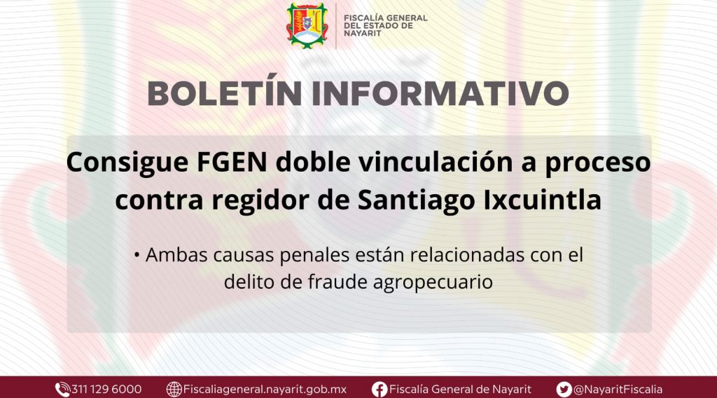 La Fiscalía General del estado de Nayarit obtuvo doble vinculación a proceso contra Alan «N», quien ocupa el cargo de regidor en el ayuntamiento de Santiago Ixcuintla; ambas causas penales están relacionadas con el delito de fraude agropecuario, cometido en perjuicio de dos personas cuyas identidades se mantienen en reserva.